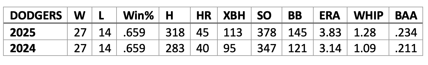 THE DODGERS HAVE THE SAME RECORD AS LAST YEAR AFTER 41 GAMES