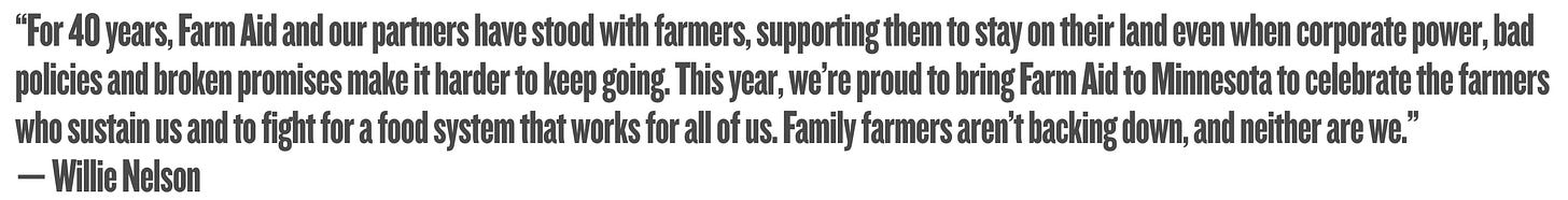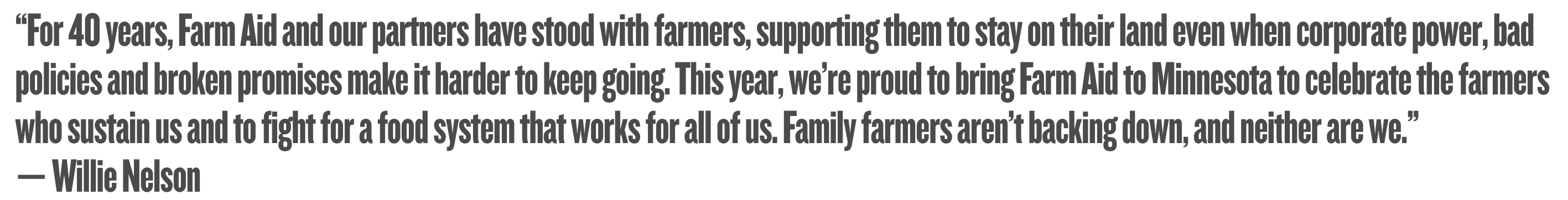 Today, watch and enjoy Farm Aid. Listen to the music. Listen to the stories. There is nothing more American than our farmers. They are the history of this country. Family farming is not a partisan issue. Family farming is about eating healthy and keeping the land healthy so that we will have food today and tomorrow.