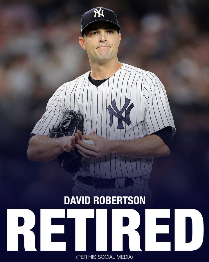 David Robertson has announced his retirement after 17 seasons, one All-Star selection, and a 2009 World Series championship with the Yankees. Robertson pitched in the postseason in 10 of his 17 seasons. Robertson was the last active player to have won a World Series as a New York Yankee.
