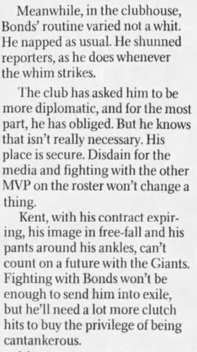 Gwen Knapp in the San Francisco Chronicle on June 27 wrote that as reporters entered the clubhouse, Bonds ignored the reporters and Kent mooned them.