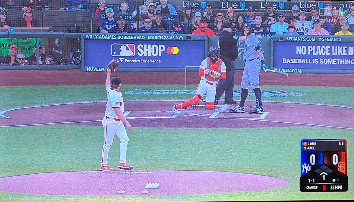 I feel bad for friend of Billy-Ball, Lauren Shehadi. In the top of the 5th inning, with José Caballero at bat, she conducted the meaningless in-game interview with Giants’ manager Tony Vitello, which is now seemingly compulsory. While doing it, Netflix missed the very first Automatic Ball-Strike challenge in regular-season history. Not her fault. She does a good job. The folks in the truck screwed this up.