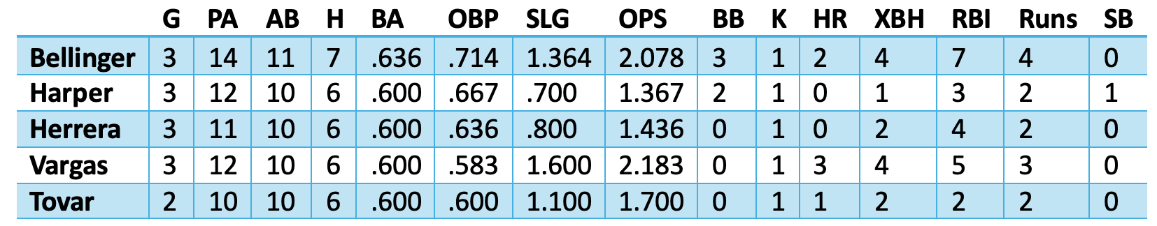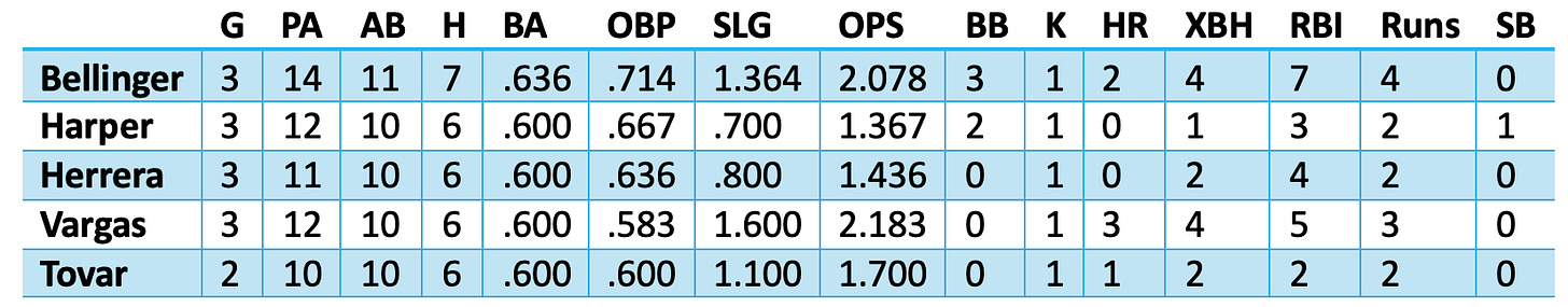 Five batters hit over .600 this weekend: Cody Bellinger (Yankees), Bryce Harper (Phillies), Iván Herrera (Cardinals), Miguel Vargas (White Sox), and Ezequiel Tovar (Rockies).